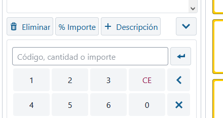 • % Importe: Permite aplicar descuentos y modificar el importe en la línea seleccionada actualmente. Por ejemplo, si un precio es erróneo o por cualquier otra circunstancia. Debe estar habilitado el teclado de números que se despliega o se oculta con la flecha que hay a la derecha del botón “+Descripción.
